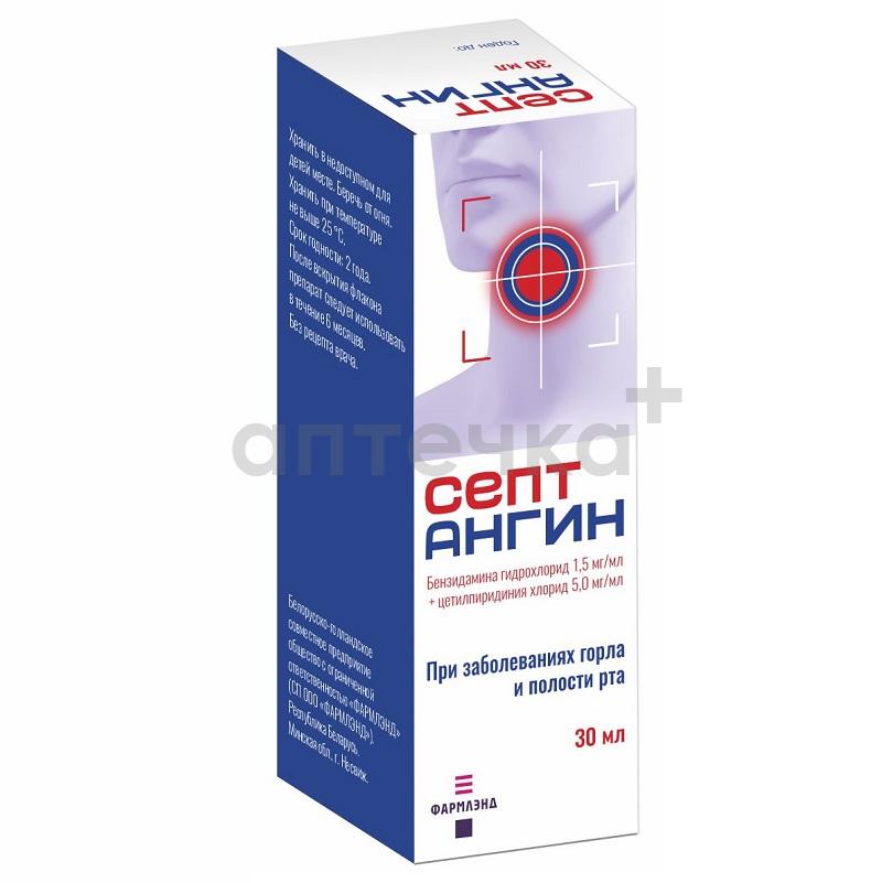 СЕПТАНГИН (спрей для слизистой оболочки полости рта 1,5мг/мл+5,0мг/мл фл. 30 мл №1)