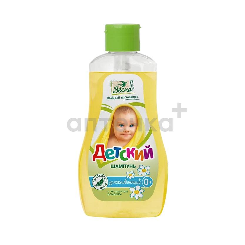 Детский шампунь Весна создан для ухода для очищения волос и кожи головы наворожённых и маленьких детей. Деликатно очищает волосы любой дины и облегчает расчесывание, быстро и легко смывается не вызывая раздражений. Инновационная мягкая формула шампуня не сушит кожу головы и не нарушает структуру волос. Экстракт календулы ухаживает за нежной чувствительной кожей головы, насыщает витаминами и активизирует рост волос. Не вызывает аллергических реакций и не раздражает глаза при случайном попадании (купание без слёз), не содержит опасных ингредиентов: красителей, щелочей. Гипоаллергенный состав. Подходит для детей с рождения.