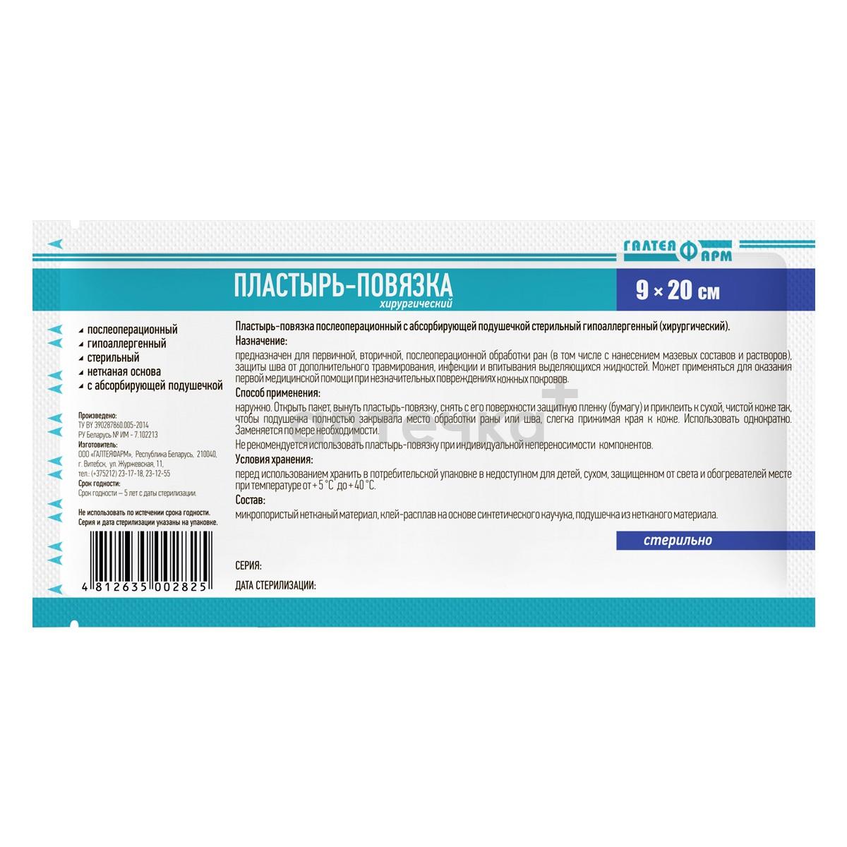 Пластырь-повязка (послеоперационный с абсорбирующей подушечкой стер. гипоаллергенный (хирургический) 9х20 см )